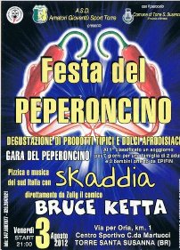 Appuntamento gastronomico a Torre Santa Susanna per degustare il peperoncino in svariate salse, e altri prodotti tipici magari immaginando per l'occasione di gustare dell'ottimo vino testato e garantito Tipico Italia , il tutto contornato dalla musica popolare dei Malvasia. Inoltre gara per mangiatori di Peperoncino, ed il Dott. Michelle D'Addario dell'Accademia del Peperoncino Nazionale, che presenta gli effetti benefici del peperoncino per la salute.