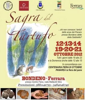 TIPICO ITALIA NEWS - L'Associazione Tartufai Bondeno "Al Ramiol", in collaborazione con la Città di Bondeno, l'Associazione Città del Tartufo, la Provincia di Ferrara e Ferrara Terra ed Acqua, Vi invita alla Sagra del Tartufo di Bondeno, dove la cucina classica ferrarese e le sue rivisitazioni si sposano con la perla di questo territorio: il TARTUFO. L’evento si terrà nei gironi 12, 13, 14, 19, 20 e 21 Ottobre 2012 presso il Centro Fiera di Bondeno, in concomitanza con la centenaria Fiera di Ottobre e Panarea la fiera del pane.