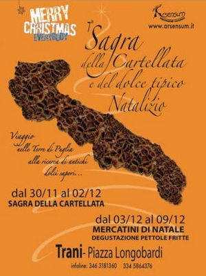 TIPICO ITALIA NEWS - La sagra quest'anno avrà una nuova location, la nuova piazza Longobardi nel cuore del centro storico della città di Trani. La sagra prevede la presenza di vari stand eno-gastronomici ed altri di vari articoli, sarà presente uno stand riservato alle associazioni pasticcieri e cuochi dove trovare le preparazioni tipiche della gastronomia locale e non oltre ad una postazione esclusiva per la preparazione e la degustazione dei dolci tipici.